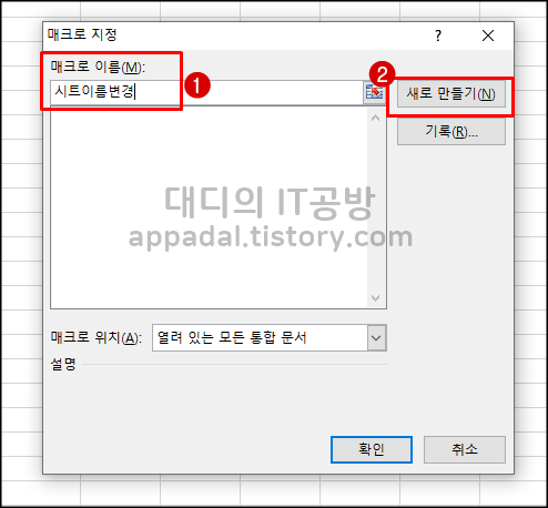 매크로 지정창에서 매크로 이름은 변경해 주고 "새로 만들기"를 클릭합니다.