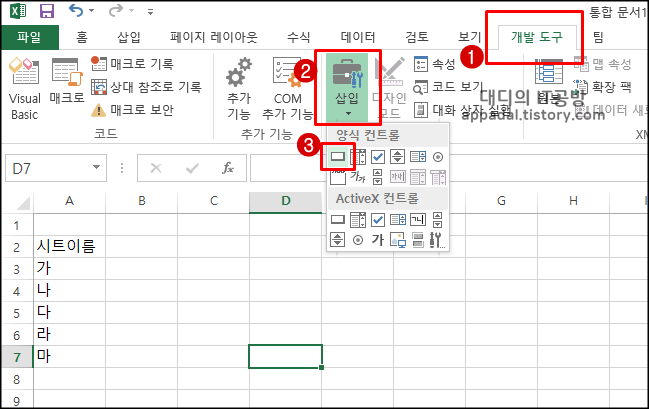 A3부터 A7셀까지 변경하고 싶은 시트의 이름을 적어 놓습니다. 그리고 상단 메뉴에서 "개발 도구-삽입-양식컨트롤"에서 버튼을 선택해 줍니다.