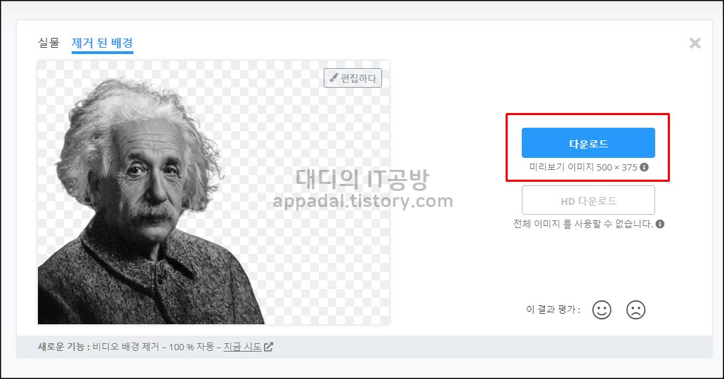 파일을 올리면 자동으로 배경이 제거된 상태를 보여 줍니다. 인물만 남기도 뒤에 있는 배경이 모두 제거가 된 것을 확인하실 수 있습니다. 여기에서 다운로드 버튼을 클릭하면 배경이 제거된 상태의 사진을 다운로드하여 저장할 수 있습니다.