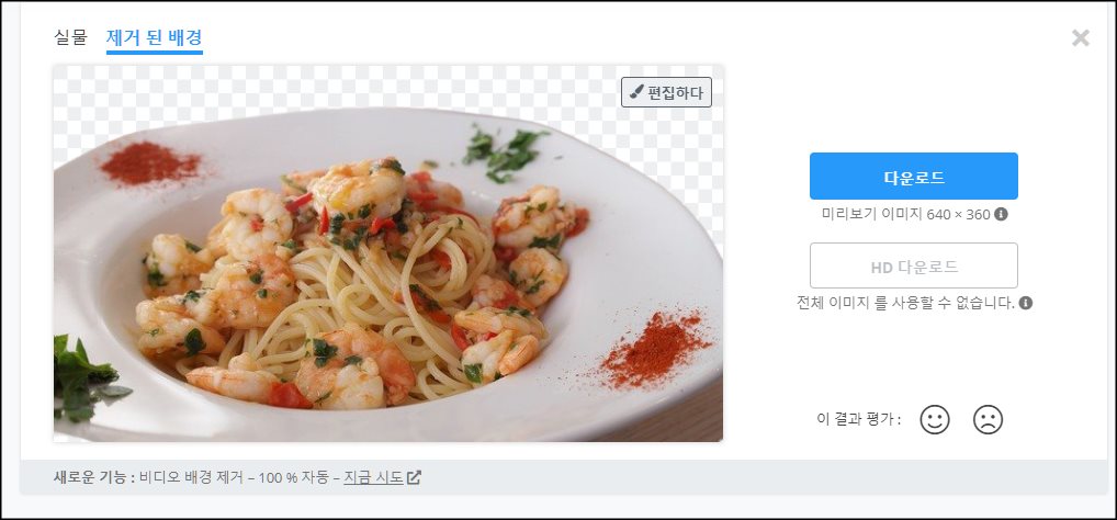 앞에 있는 접시 외에 다른 뒤에 있던 배경 사진이 모두 제거된 상태로 나타났습니다.