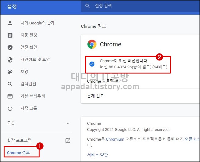 설정 화면 왼쪽 아래쪽에 있는 'Chrome 정보'를 클릭하면 현재 chrome 버전을 확인하는데 최신 버전이 아닐 경우 자동으로 최신 버전으로 업데이트를 합니다. chrome 88버전이면 크롬에서 따로 설정을 하지 않아도 자동으로 플래시를 비활성화시켜줍니다.