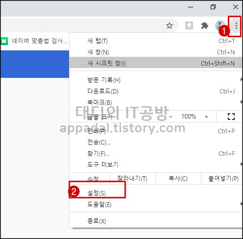 크롬을 실행한 후 오른쪽 끝에 있는 점 아이콘을 클릭하고 '설정' 메뉴를 클릭해 줍니다.
