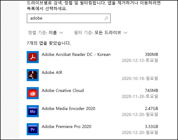 프로그램 검색에서 'adboe'를 입력하면 관련 설치된 프로그램들이 나타나는데 여기에서 어도비 플래시 플레이어가 있다면 선택해서 삭제를 해주시면 됩니다.