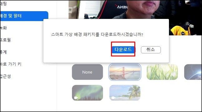 가상 배경을 다운로드 받겠냐고 묻는 메시지가 나타나는데요. '다운로드' 버튼을 클릭하면 됩니다. 다운로드하는데 인터넷 환경에 따라서 조금 시간이 걸릴 수 있습니다.