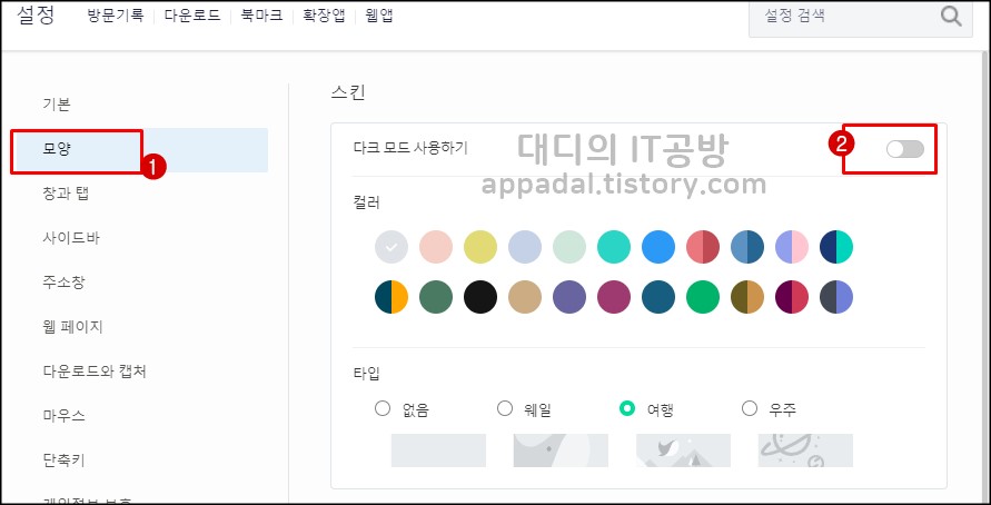 설정 버튼을 클릭한 다음에는 왼쪽에 모양을 클릭하면 네이버 웨일 브라우저 스킨이 나타납니다. 기본은 사용 안 함으로 설정이 되어 있습니다. 2번 아이콘을 클릭 하면 다크 모드 사용하기가 활성화됩니다.