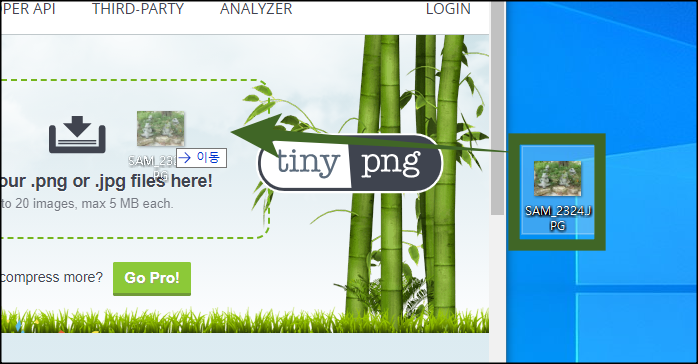 사용 방법은 아주 간단합니다. 줄이고 싶은 사진을 홈페이지 네모칸 안에 드래그엔 드롭으로 사진을 옮겨 주기만 하면 끝납니다.