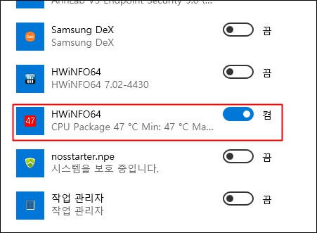 3. 여러 가지 아이콘들이 나오는데 HWiNFO64 프로그램을 켬으로 변경시켜 줍니다.