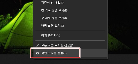 1. 작업표시줄에 CPU 온도가 나오도록 표시해 보도록 하겠습니다. 작업실표시줄에 마우스를 올려놓고 오른쪽 마우스 버튼을 클릭합니다. 그리고 '작업 표시줄 설정'을 클릭합니다.