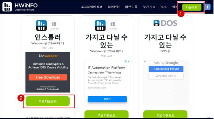1. 구글에서 HWiNFO를 검색하여 홈페이지로 이동할 수 있습니다. 홈페이지에 들어가면 오른쪽 상단에 '다운로드' 메뉴가 있습니다. 다운로드 버튼을 클릭한 다음 왼쪽 하단에 있는 '무료 다운로드'에 마우스를 올려놓습니다.