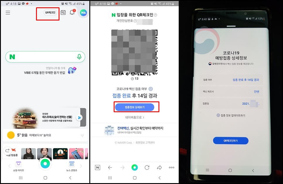 2. 다시 QR체크인을 클릭하고 접종정보 상세보기를 클릭하면 코로나 예방접종 기록을 확인할 수 있습니다.
