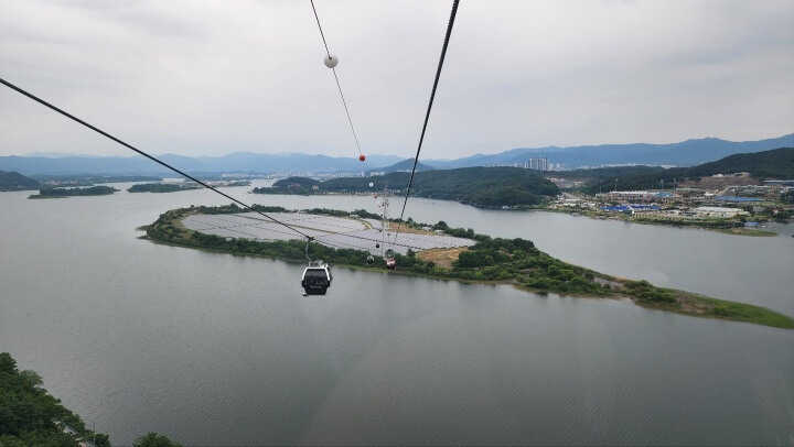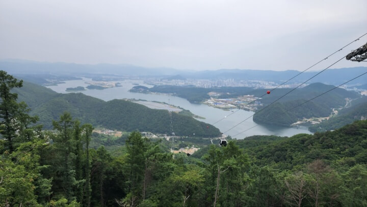 삼악산 정차장 위에서 내려다본 모습입니다. 이날 비가 오늘 날씨라 조금 흐렸습니다. 비가 안 왔으면 더 좋았을 텐데 조금 아쉬웠습니다. 날씨 좋은 날은 춘천 시내가 모두 보일 것 같더라고요.