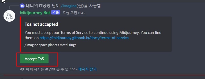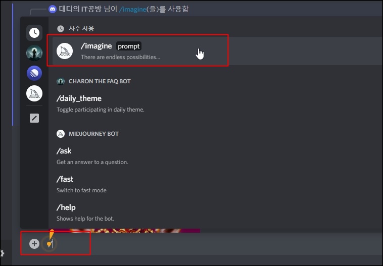 5. 입력 박스에 슬래스 '/'를 입력하고 상단에 '/imageine prompt'를 클릭합니다.