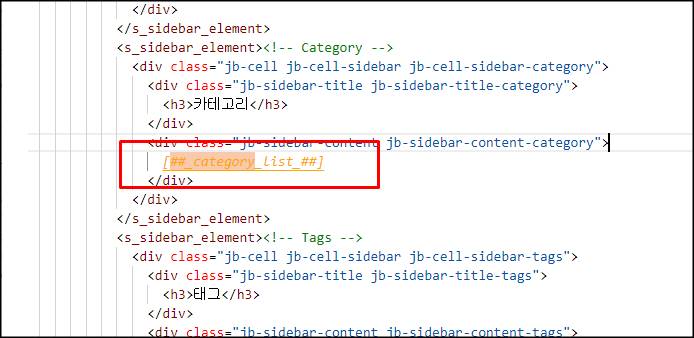 html 편집 화면에서 Ctrl + F 키를 눌러 ##_category_list_## 치환자를 찾아줍니다. 저는 이미 카테고리가 접혀 있어 뒷부분이 없는 것입니다.