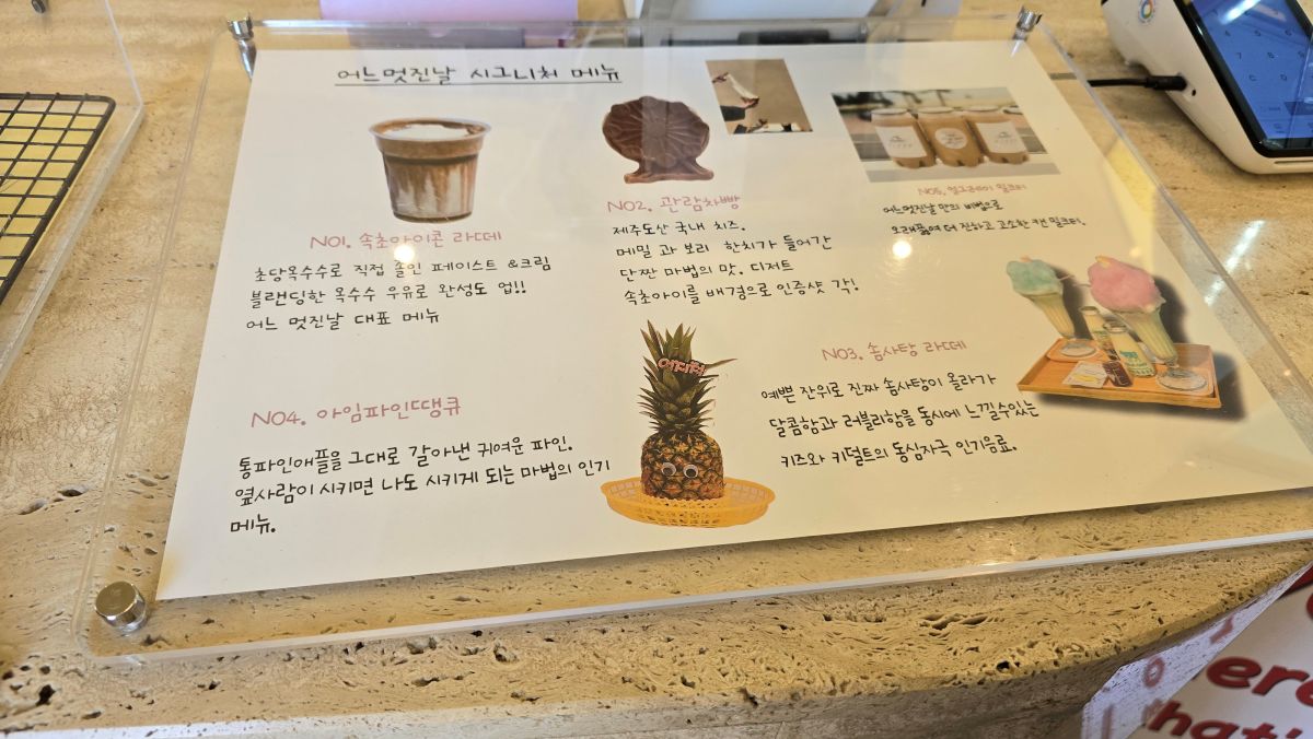 카페에 들어가면 어느멋지날 시스니처 메뉴가 있습니다. 저희는 관람차빵하고 아임파인땡큐, 밀크티를 주문했는데요.