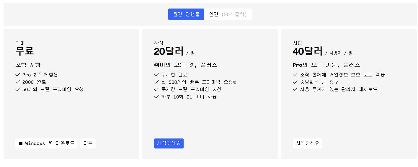 Cursor Ai 기본 사용료는 무료입니다. 무료에는 기능 및 사용량이 제한되어 있지만 처음 사용하시는 분들은 무료로 사용하다 사용량이 많으면 그때 유료로 사용하시면 좋을 것 같습니다.