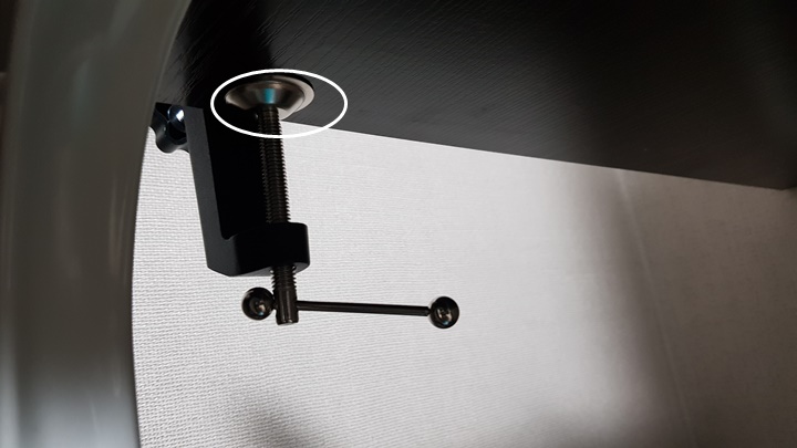 아래 사진은 스탠드를 책상과 연결하는 사진인데요. 책상과 닫는 동그란 부분이 수평이 되도록 잘 맞춰서 돌려줘야 잘 고정이 됩니다.