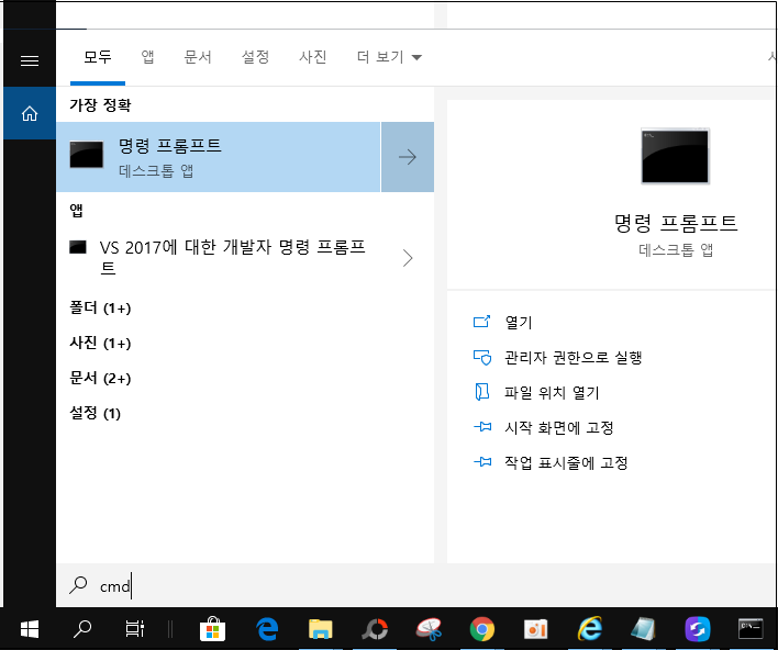 작업표시줄에 있는 돋보기 모양의 아이콘을 클릭하여 cmd 명령 프롬프트를 실행시켜줍니다.