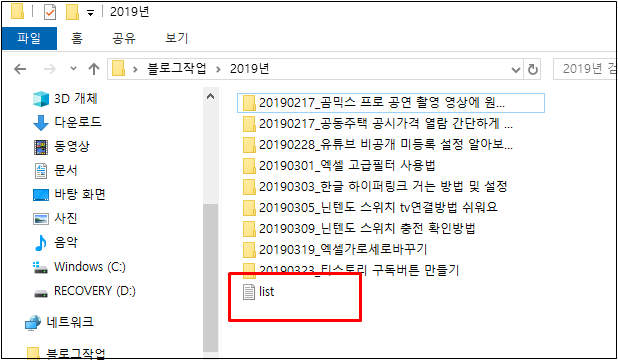 지금까지 폴더 파일 이름 목록 리스트 만들기 방법을 알아보았는데요. 저도 1년에 한두 번 작업을 하다 보니 잊어버릴 때가 있어서 제가 만든 자료를 보고 따라 할 때가 있습니다. 여러분들도 이런 방법도 있다는 것만 알아두시고 사용하실 일이 있을 때 그대 제 블로그에서 자료를 찾아보시면 될 것 같습니다. 오늘도 즐거운 하루 보내시기 바랍니다.