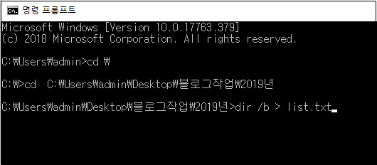 이제 해당 폴더에 있는 이름을 목록으로 만들어 보겠습니다. "dir /b >"를 입력한 다음 만들고자 하는 파일의 이름을 입력해 줍니다.